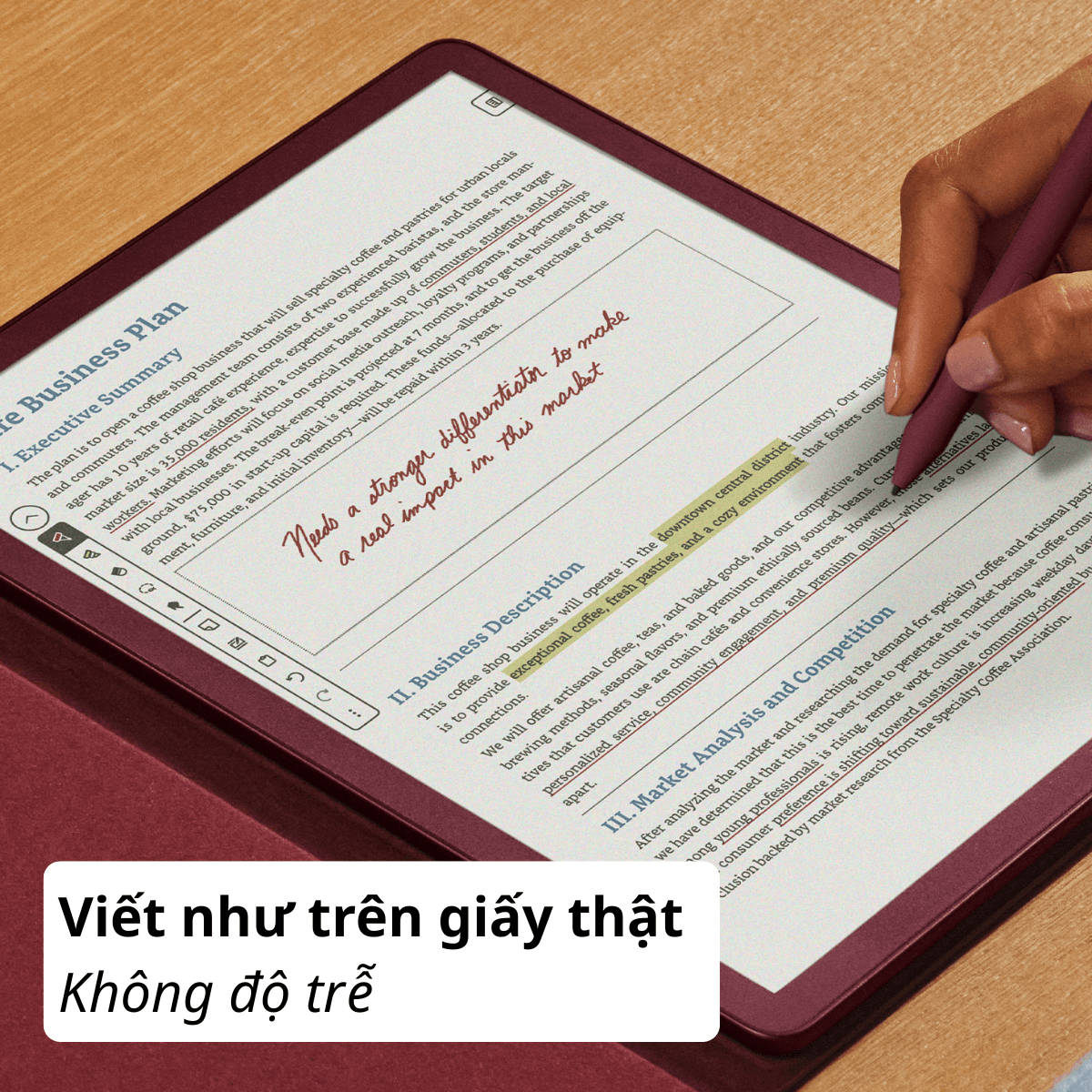 Mang đến cảm giác viết như trên giấy cho quá trình ghi chép của bạn, dễ dàng nắm trọn mọi ý tưởng. Kindle Scribe Colorsoft được tái thiết kế để tăng sự thoải mái khi cầm nắm, tăng cường độ nhạy khi viết, giúp cảm giác viết được chân thực và mượt mà hơn, gần như không có độ trễ, mang lại trải nghiệm viết và đọc tuyệt vời. Màn hình màu cỡ 11 inch sắc nét, màu sắc sinh động, chống lóa giúp bạn tập trung làm việc và đọc tài liệu, ghi chú với màu sắc trực quan. Sử dụng AI để tìm kiếm, tóm tắt, tinh chỉnh ghi chú, tất cả đều không bị làm phiền bởi thông báo hay mạng xã hội.